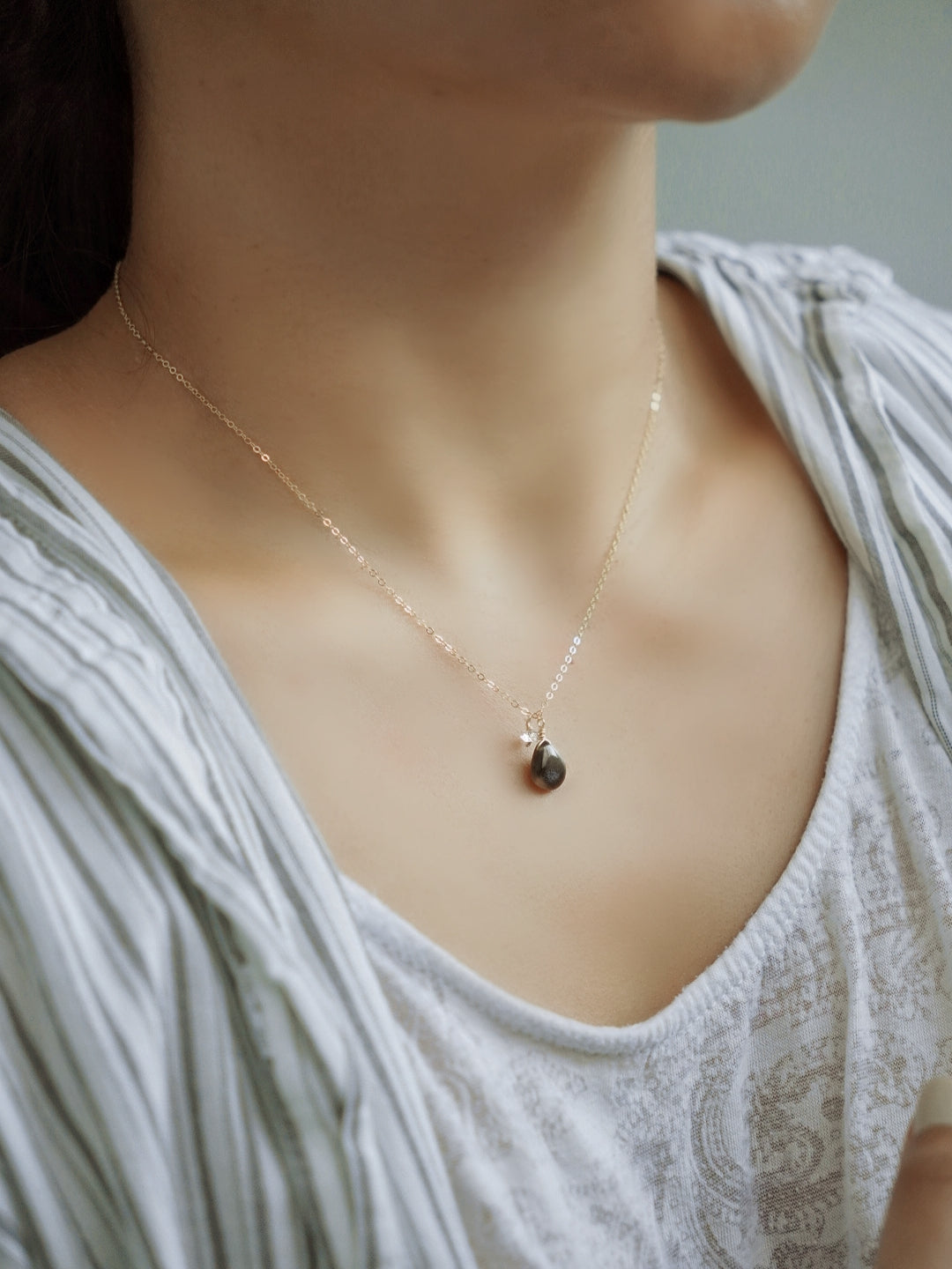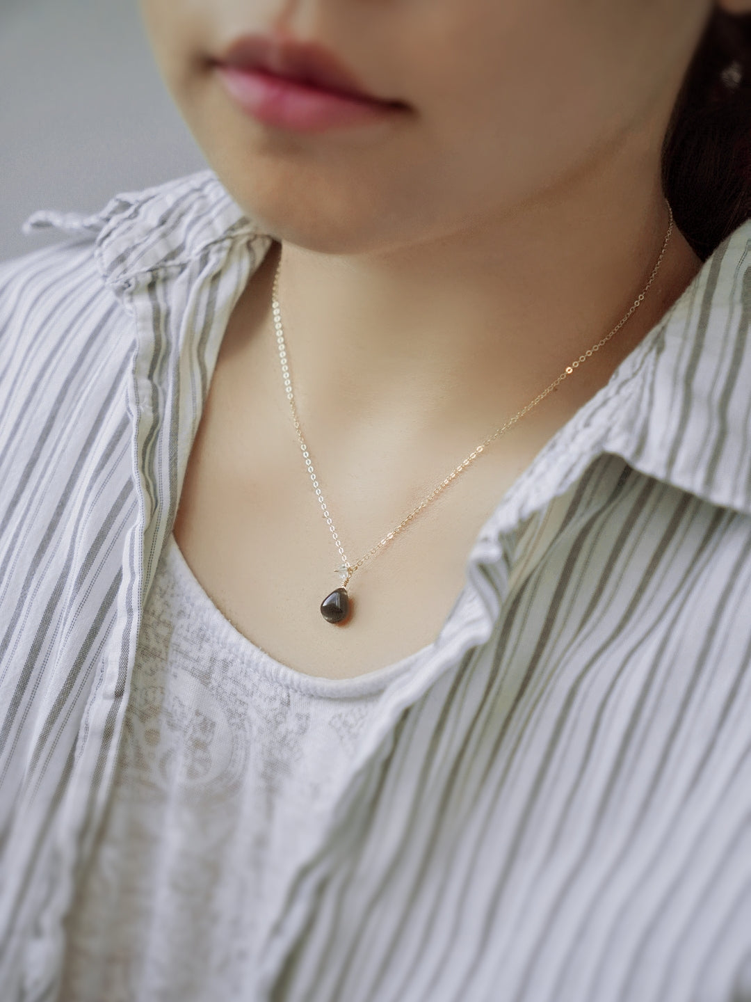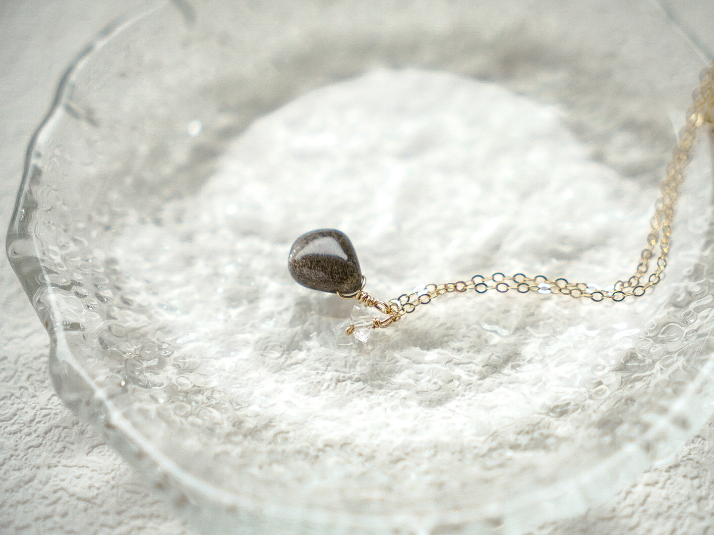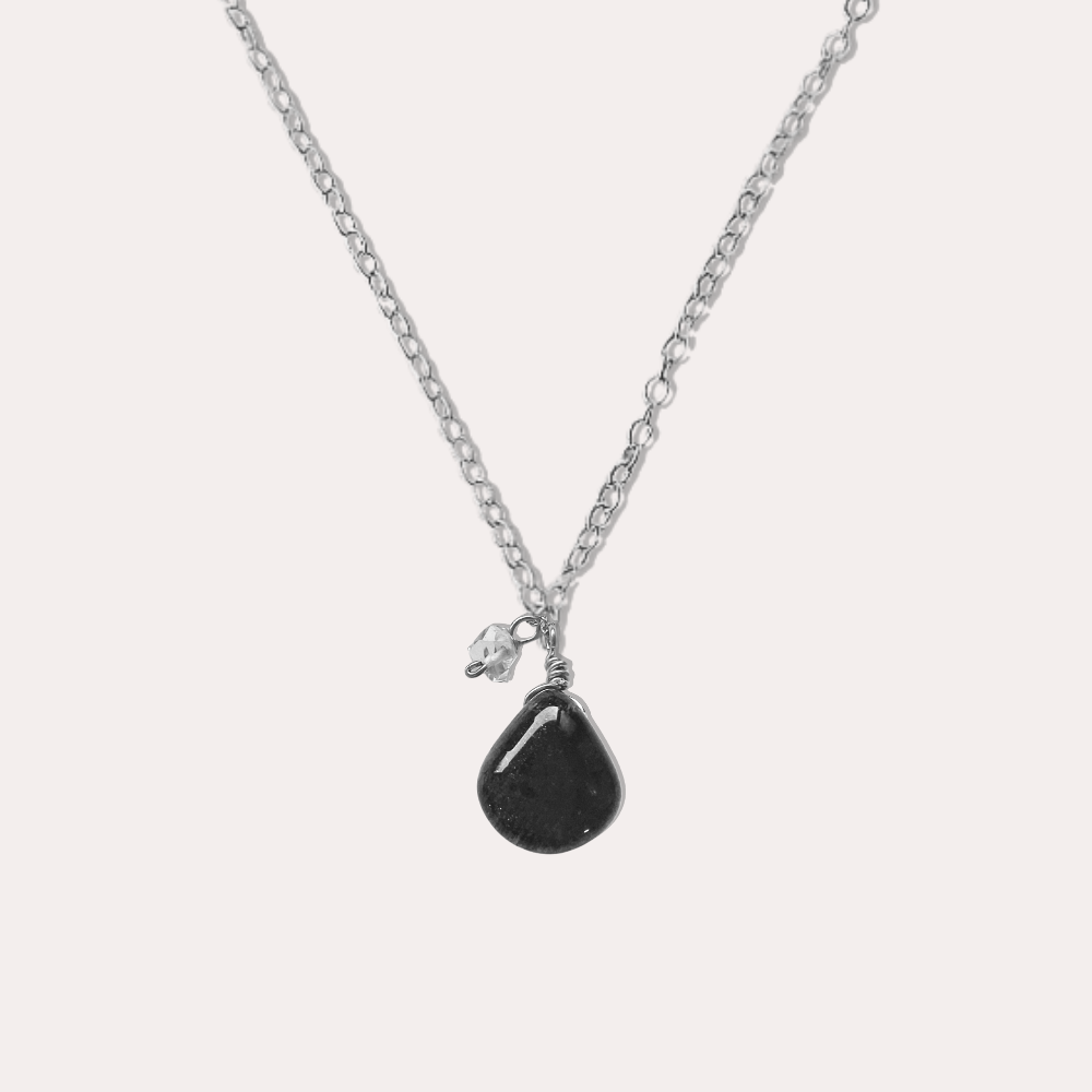 這款項鍊以水滴形狀的黑太陽石為主角,搭配小顆赫基默鑽石製成墜子,精緻而充滿力量感。在項鍊末端,一顆赫基默鑽石輕輕點綴,將來自大地深處的能量匯聚於你的胸口。黑太陽石內的纖鐵礦與赤鐵礦細絲,反射出迷人的金銀色光芒,如同宇宙的閃爍,為你驅散負能量,賦予你內在的堅定與自信。