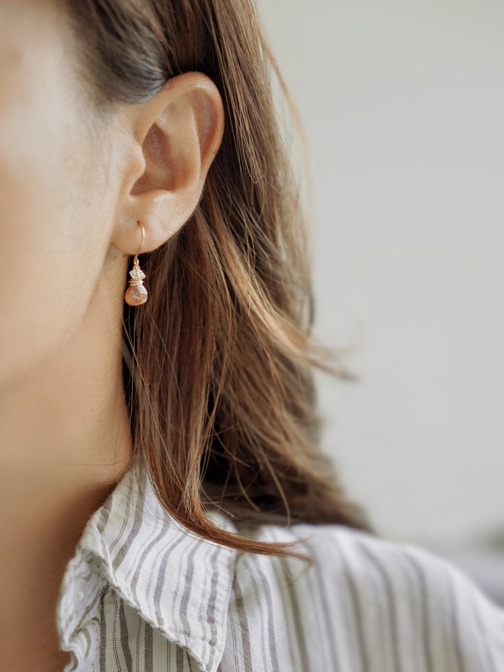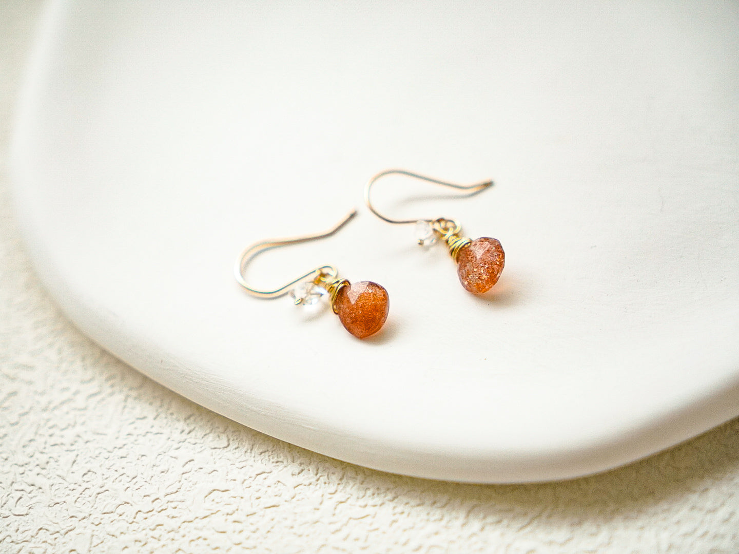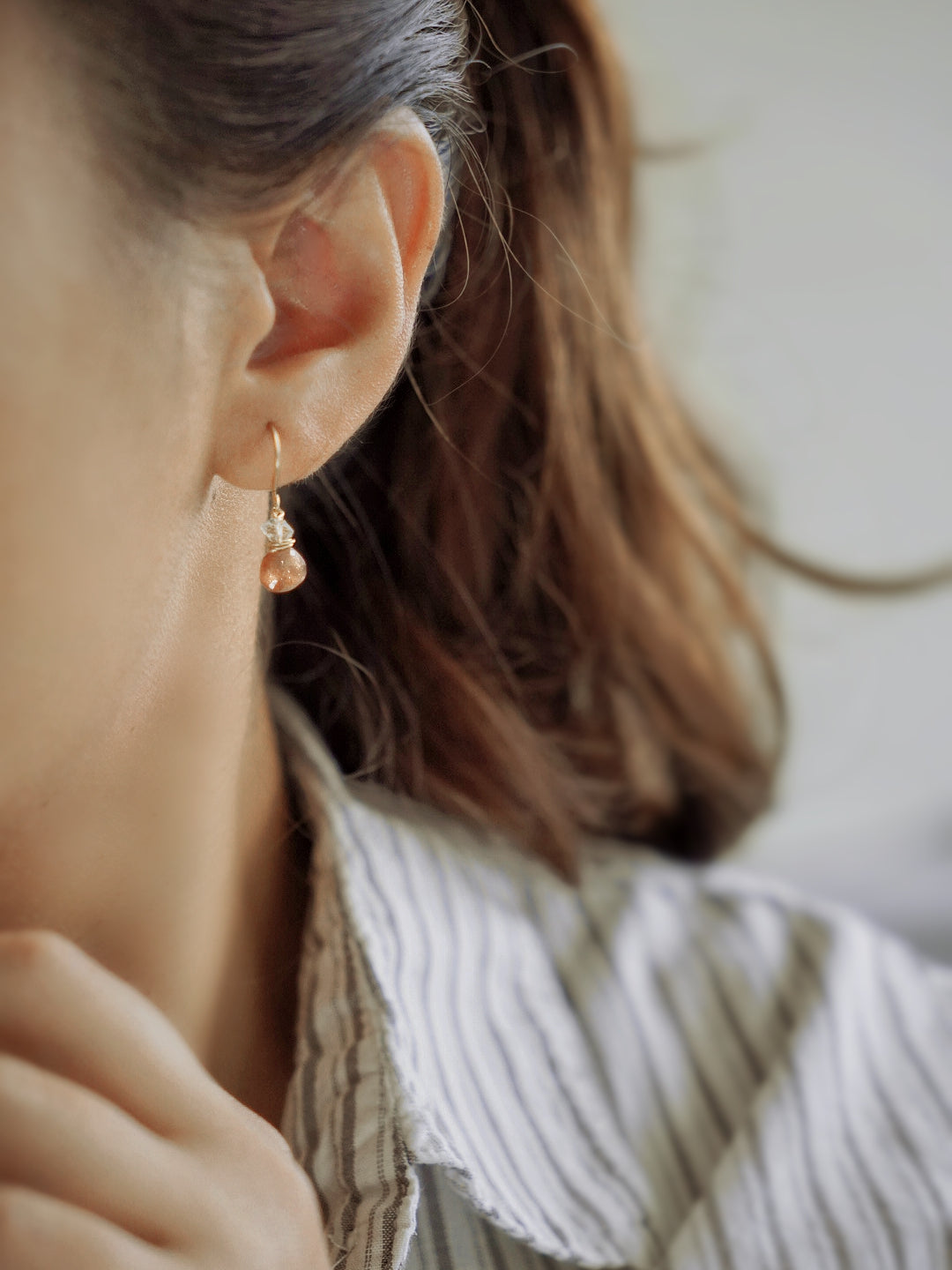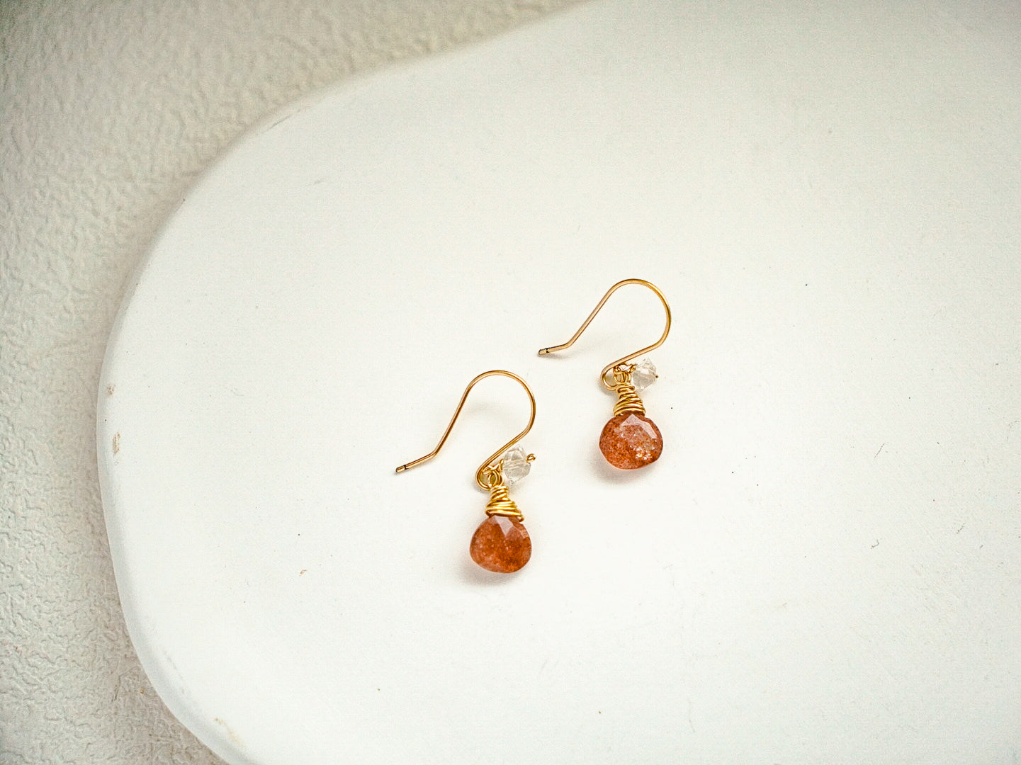 這款耳環選用了帶有刻面的水滴狀太陽石與小顆赫基默鑽石製成,精巧的設計使得光線在不同角度下,閃耀著不一樣的色彩。赫基默鑽石的純粹透明,映襯出太陽石的暖色光芒,讓每一顆太陽石與赫基默鑽石都散發著專屬的靈性光輝。每顆石頭都是大自然的精心創作,擁有獨一無二的模樣,賦予你獨特的正能量。
