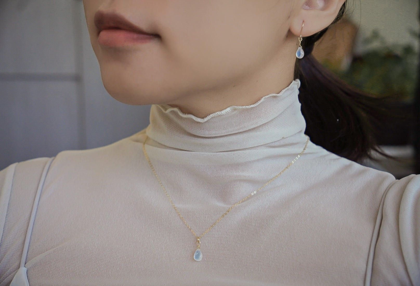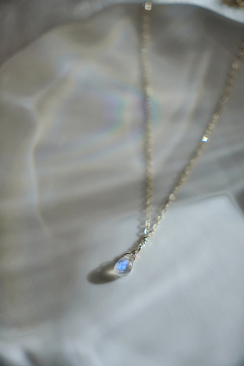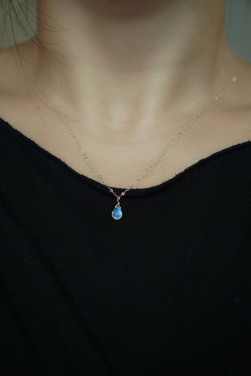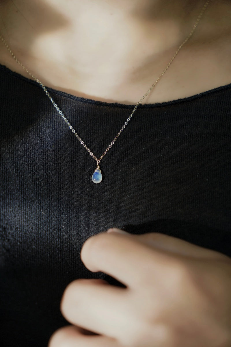選用天然水滴形月光石,透著迷人的藍色、彩虹色光澤,搭配簡約細鍊,低調卻充滿靈性光澤。