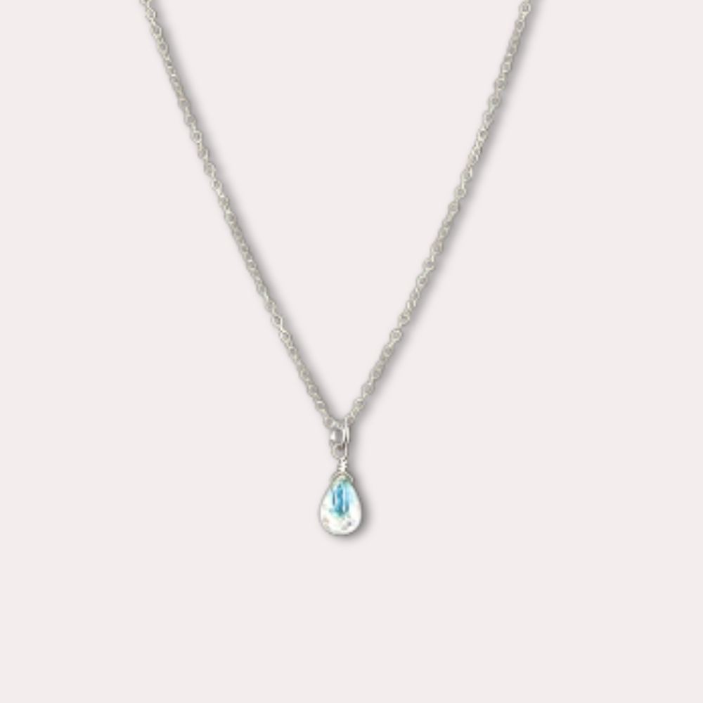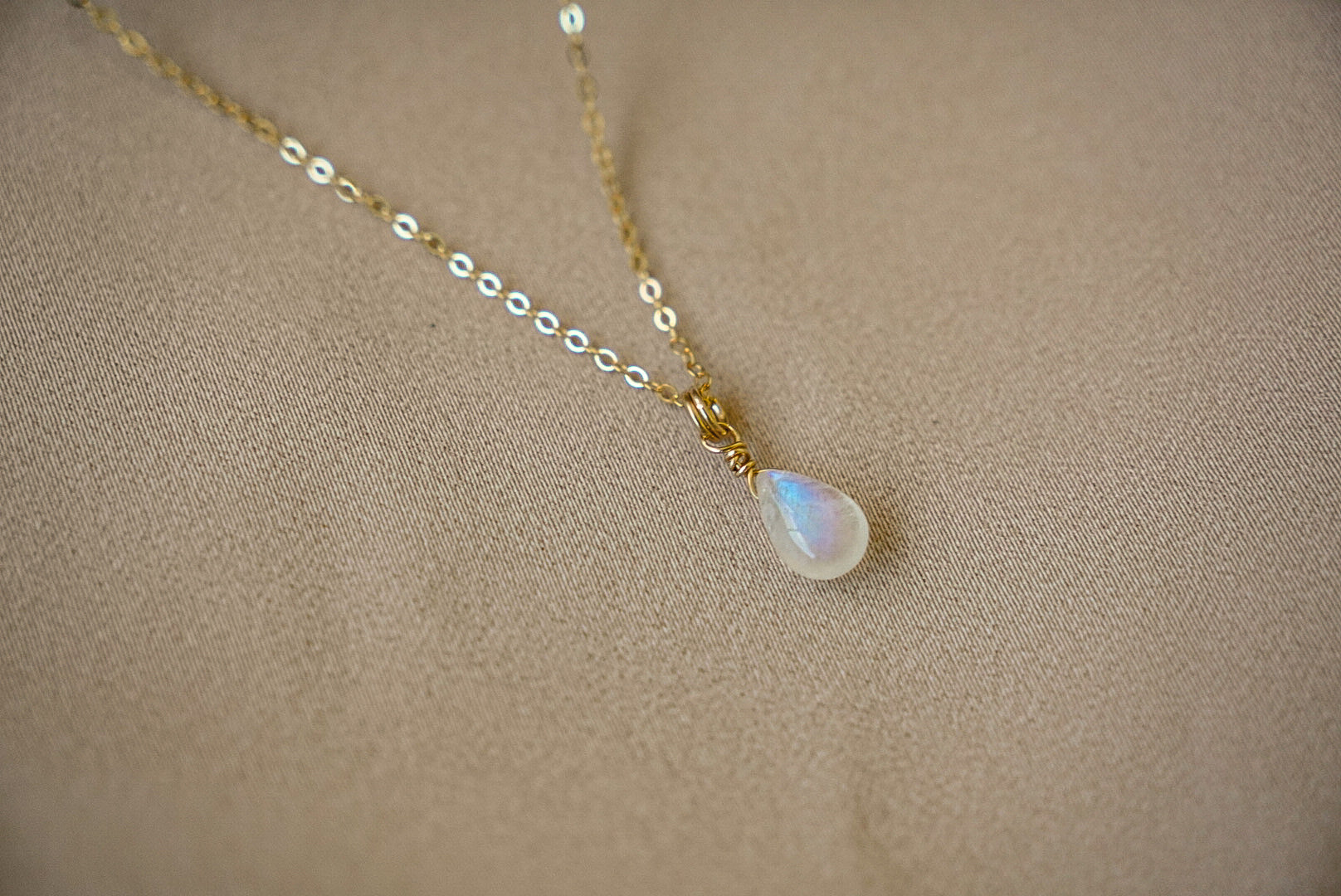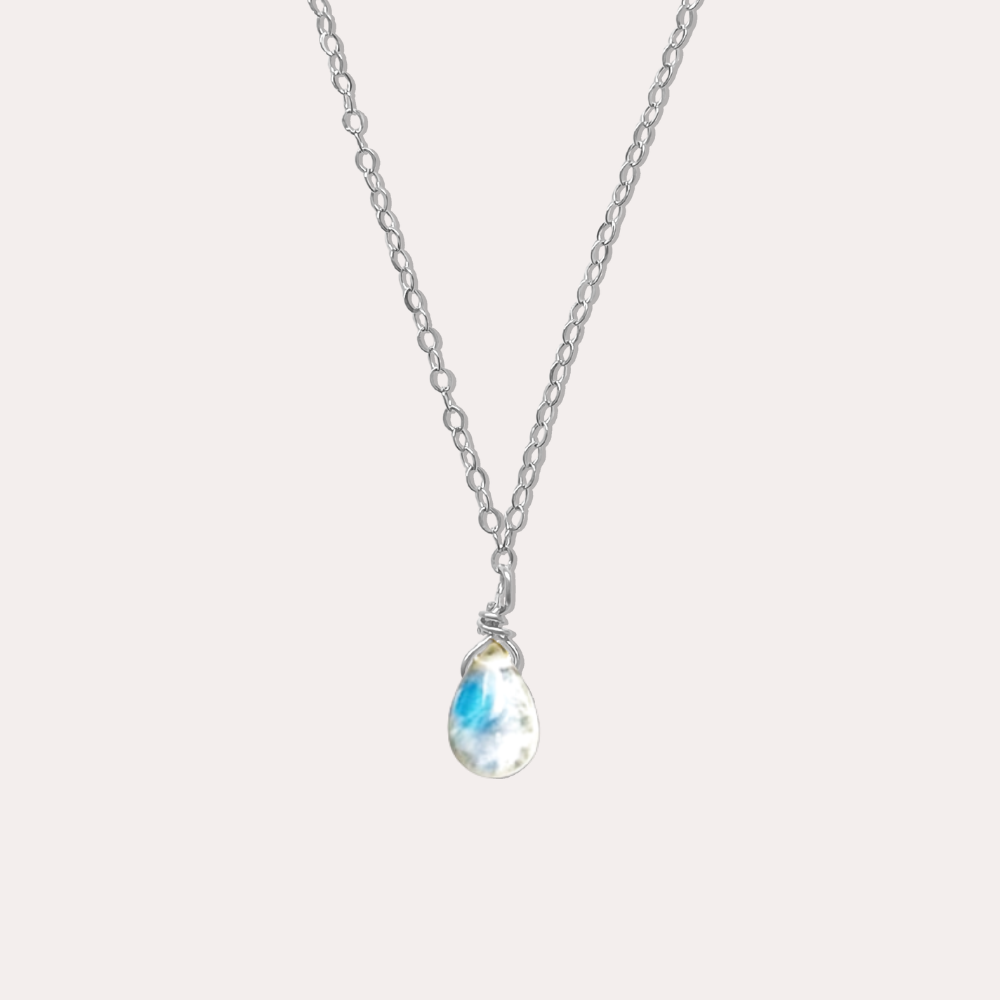 選用天然水滴形月光石,透著迷人的藍色、彩虹色光澤,搭配簡約細鍊,低調卻充滿靈性光澤。