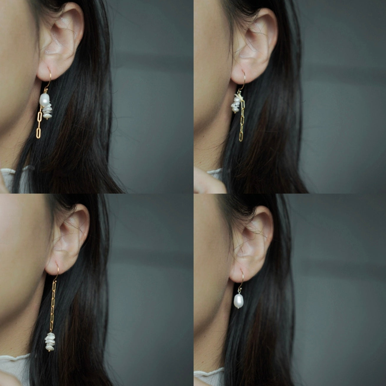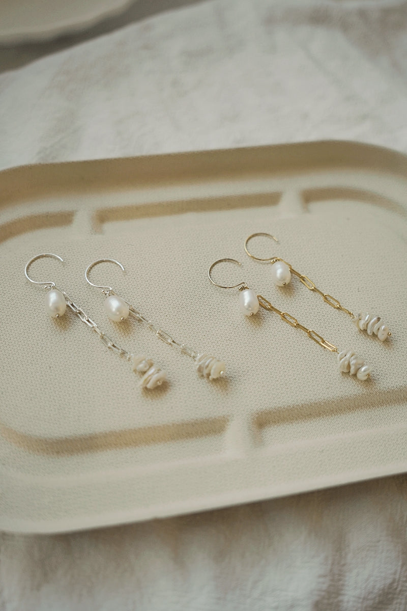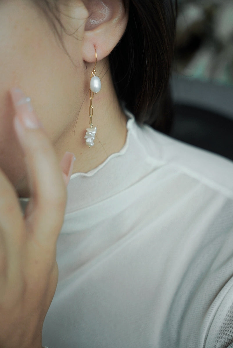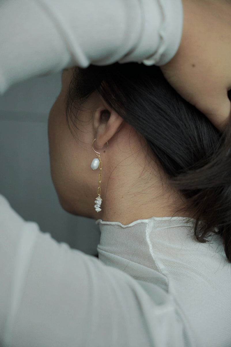 ERATO系列選用大顆橢圓珍珠,搭配方鍊與耳圈,耳環本身由三個配件組成,可以隨當日穿搭與心情,自由搭配喜歡的戴法。
