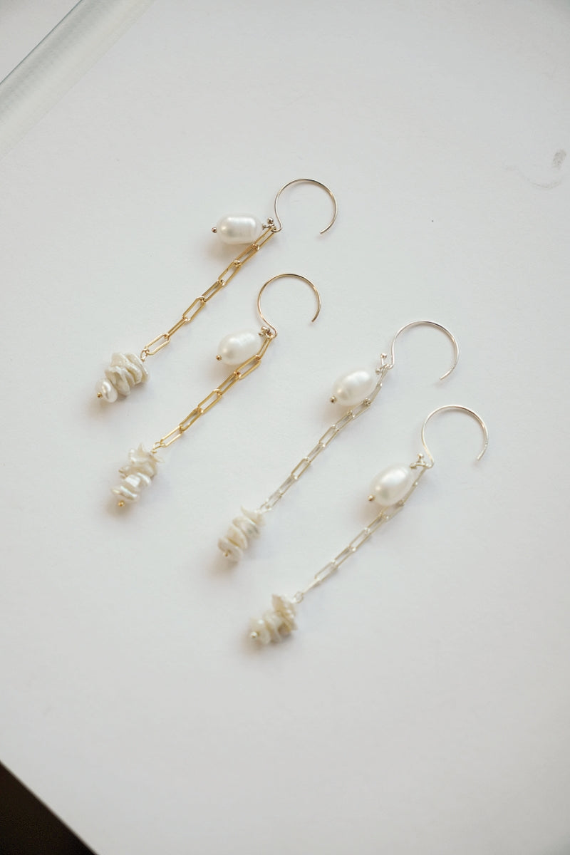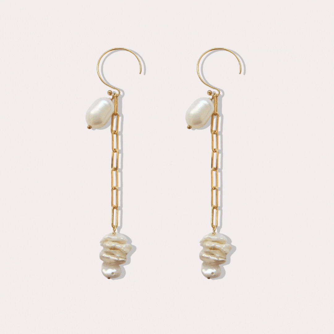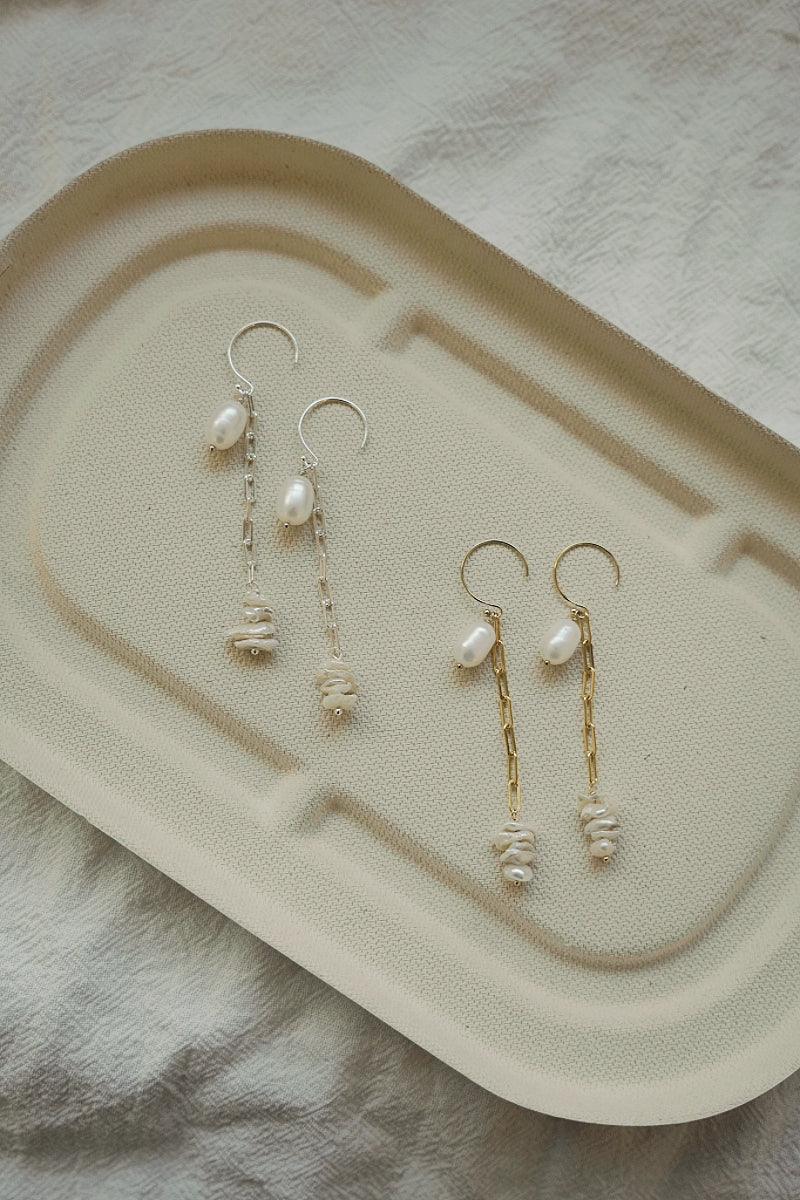 ERATO系列選用大顆橢圓珍珠,搭配方鍊與耳圈,耳環本身由三個配件組成,可以隨當日穿搭與心情,自由搭配喜歡的戴法。
