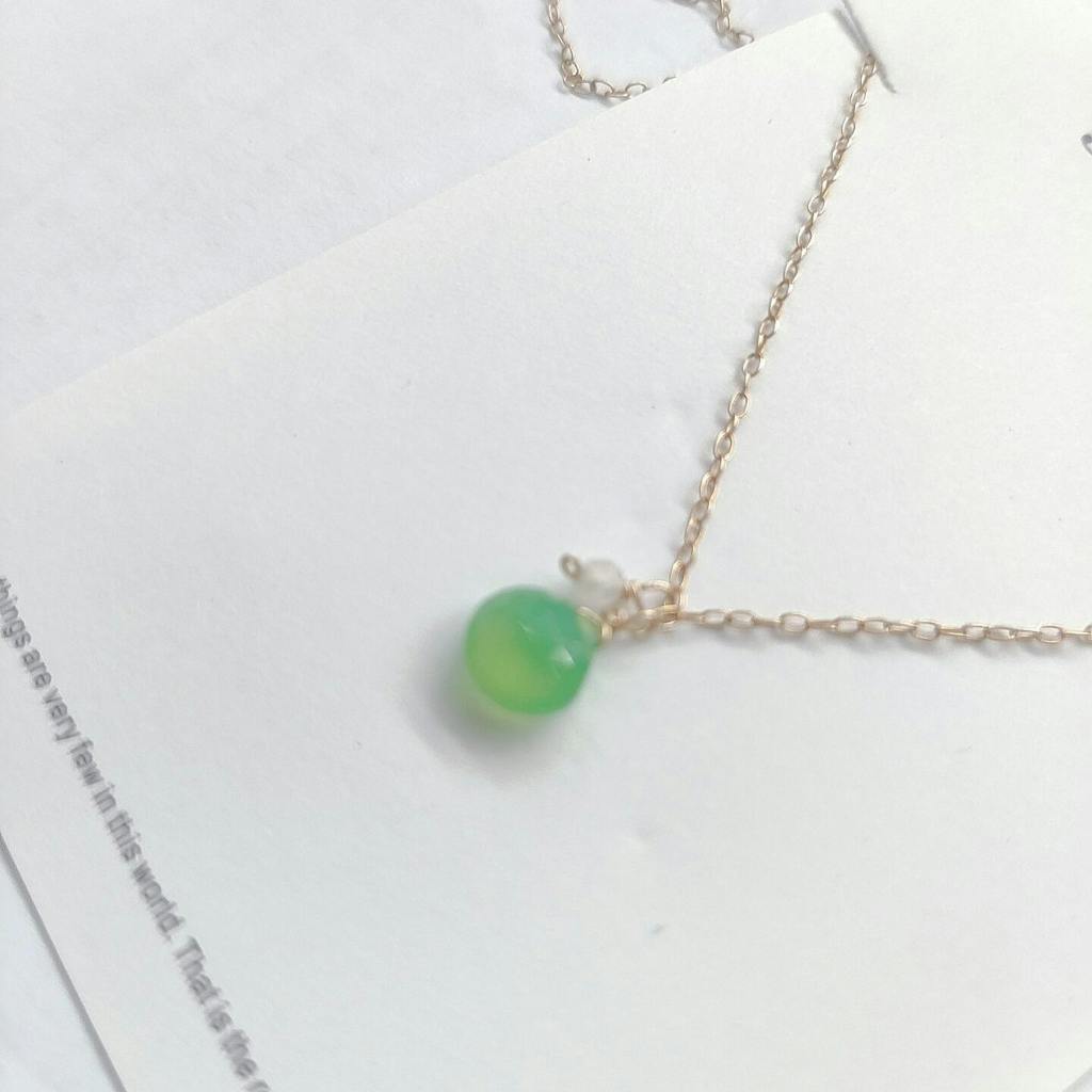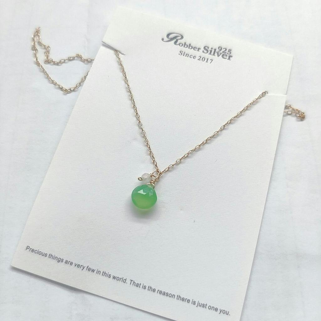 綠玉髓的沉穩配上月光石的柔白光暈結合。兩種顏色搭配呼應,戴起來有氣質,是低調的療癒系項鍊。