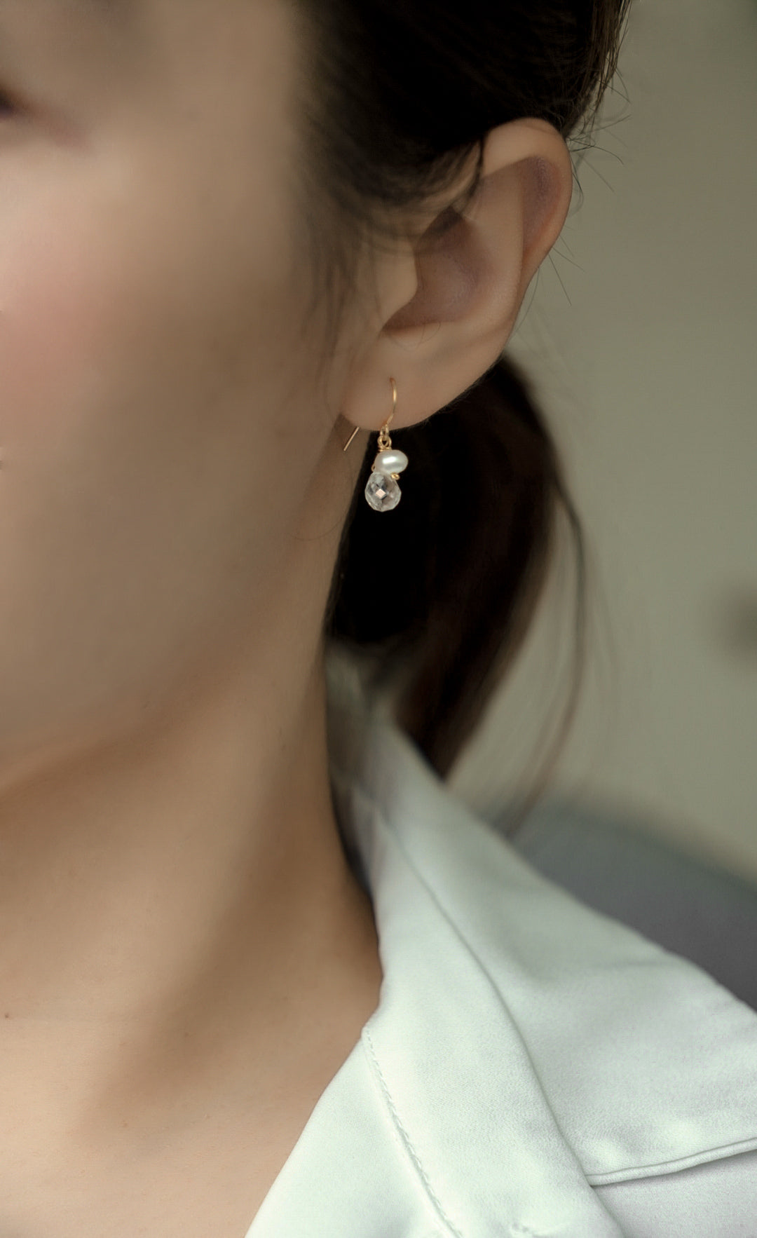 透明白水晶搭配溫潤珍珠,整體氣質滿滿,光線下會有柔和反射,戴起來自然又不浮誇。
