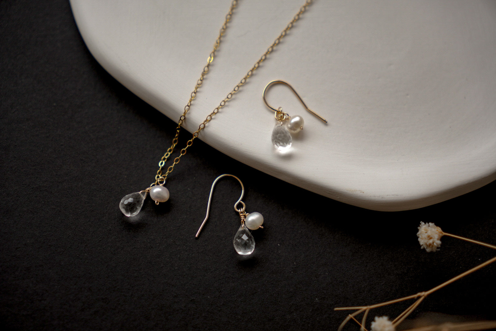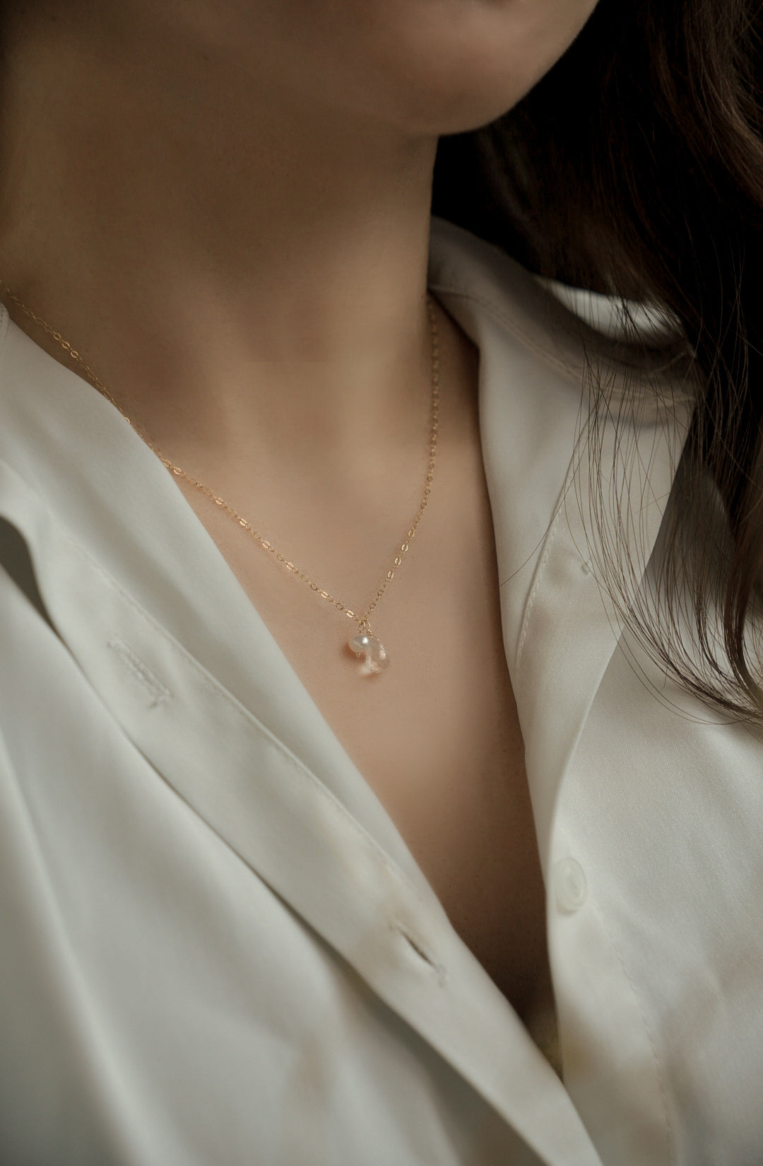 白水晶的純淨光感結合珍珠的柔和質地,呈現極簡又高級的氣場。細鍊設計讓整體更輕盈簡約。